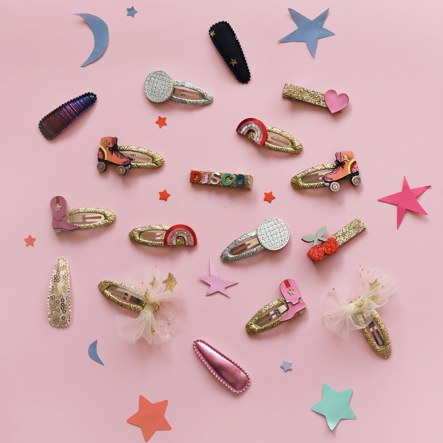Préparez-vous à briller sur la piste de danse avec ces barrettes disco ! Ce lot de trois barrettes dorées à paillettes arbore une cerise scintillante, un cœur étincelant et les lettres DISCO arc-en-ciel. L'accessoire parfait pour les petits fêtards !