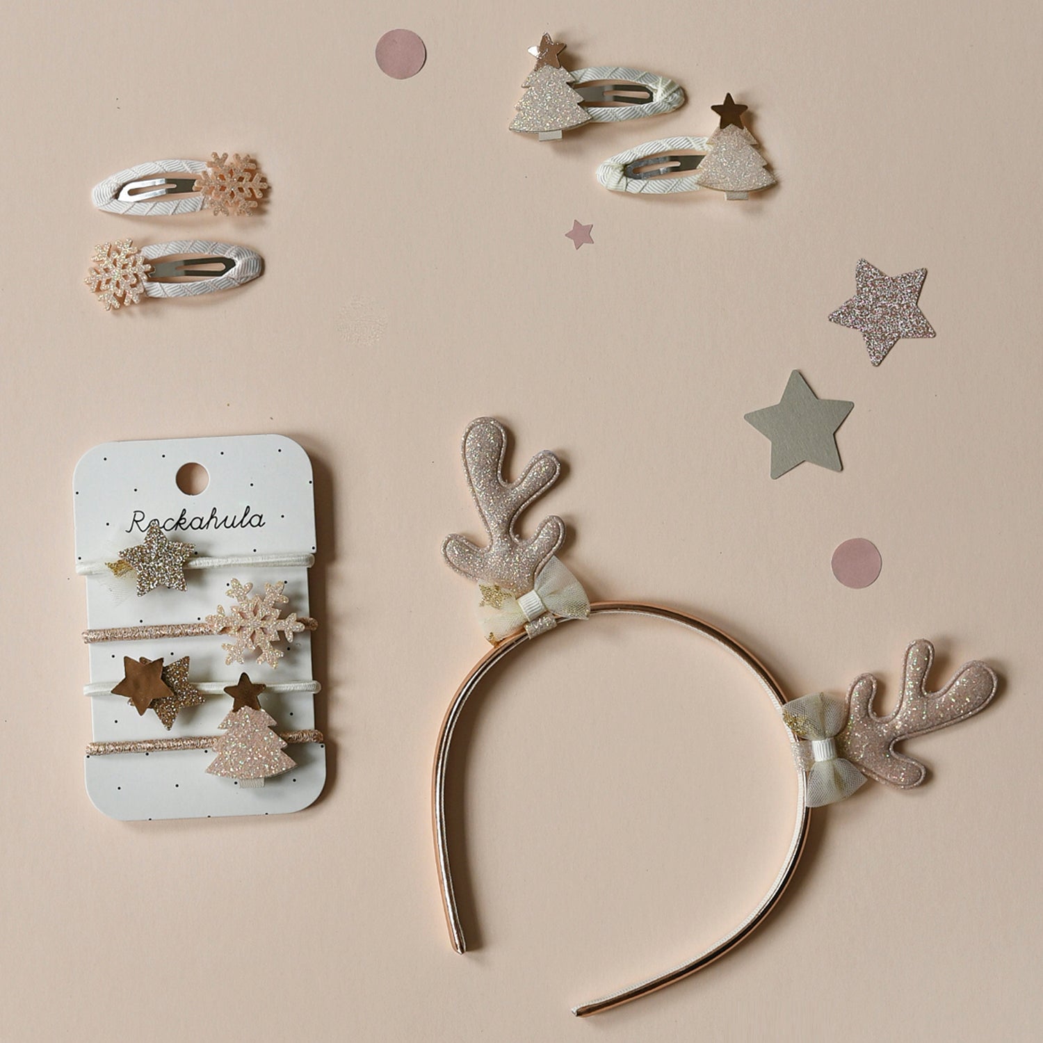 Le plus adorable des serre-têtes pour ajouter une touche festive à votre Noël ! Ces oreilles de renne rose pâle à paillettes sont ornées de nœuds en tulle doré de chaque côté. Elles sont solidement fixées sur un bandeau recouvert de polyuréthane rose doré, conçu pour un confort optimal sur les petites têtes.