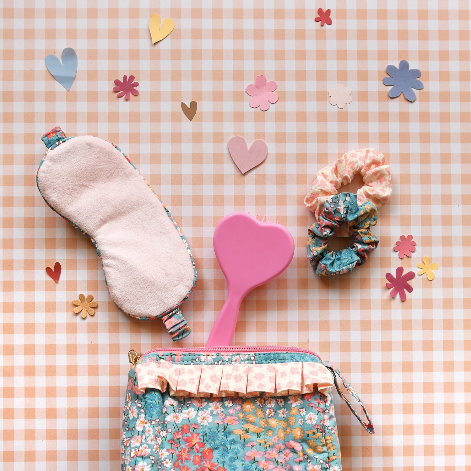 Quand l'heure du coucher rencontre la fantaisie florale ! Notre ensemble pyjama apportera une touche d'élégance alpine à toutes vos escapades nocturnes. Cette adorable trousse de toilette est confectionnée dans notre doux tissu fleuri Heidi et ornée d'un joli volant et d'une dragonne. À l'intérieur, vous trouverez une brosse à cheveux en forme de cœur, un masque de sommeil réversible et deux chouchous assortis ! L'indispensable pour les soirées pyjama des tout-petits !