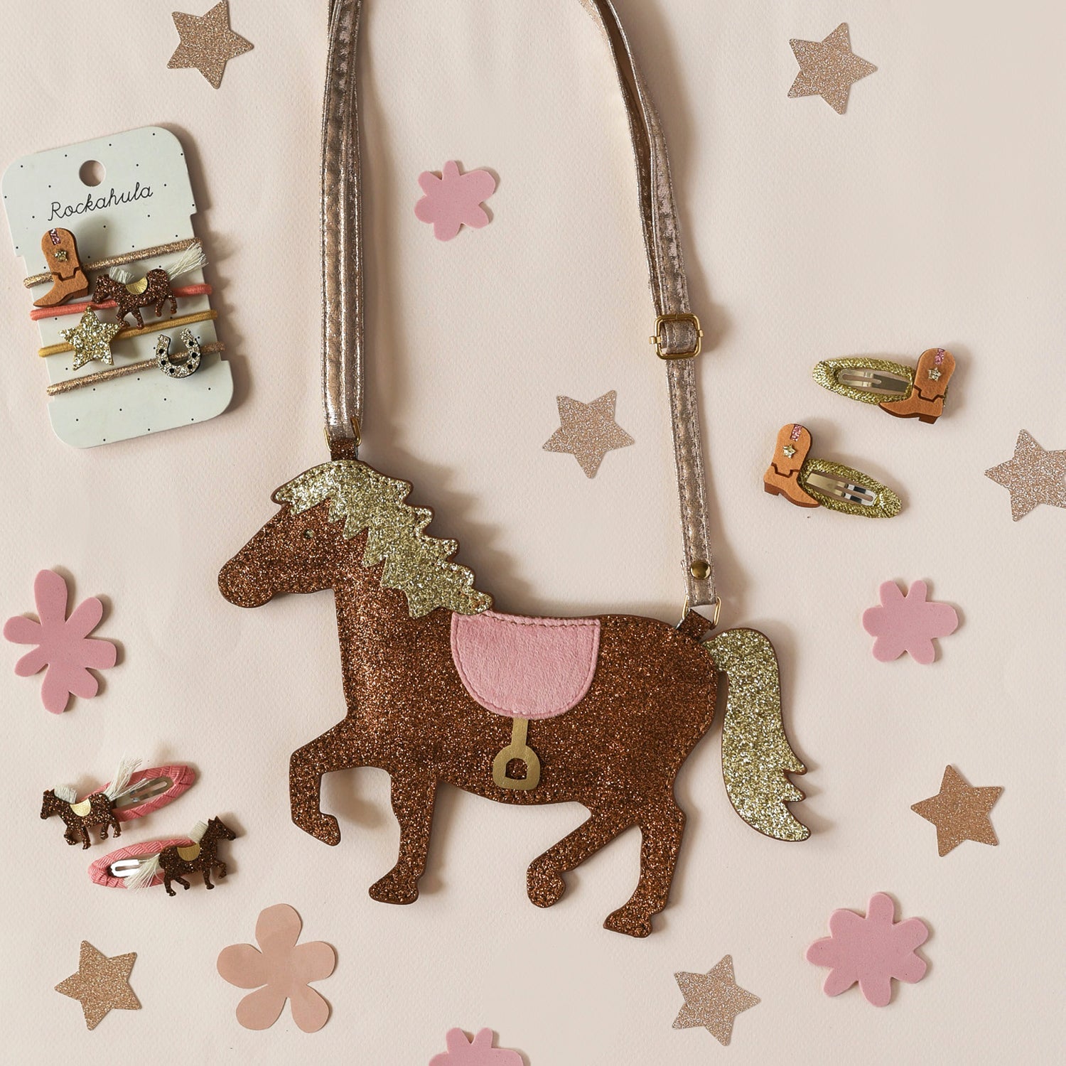 Ce lot de quatre poneys assortis comprend nos bottes de cow-girl, le poney Pippa, une étoile dorée à paillettes et un fer à cheval porte-bonheur ! Portez-les un par un ou tous ensemble !