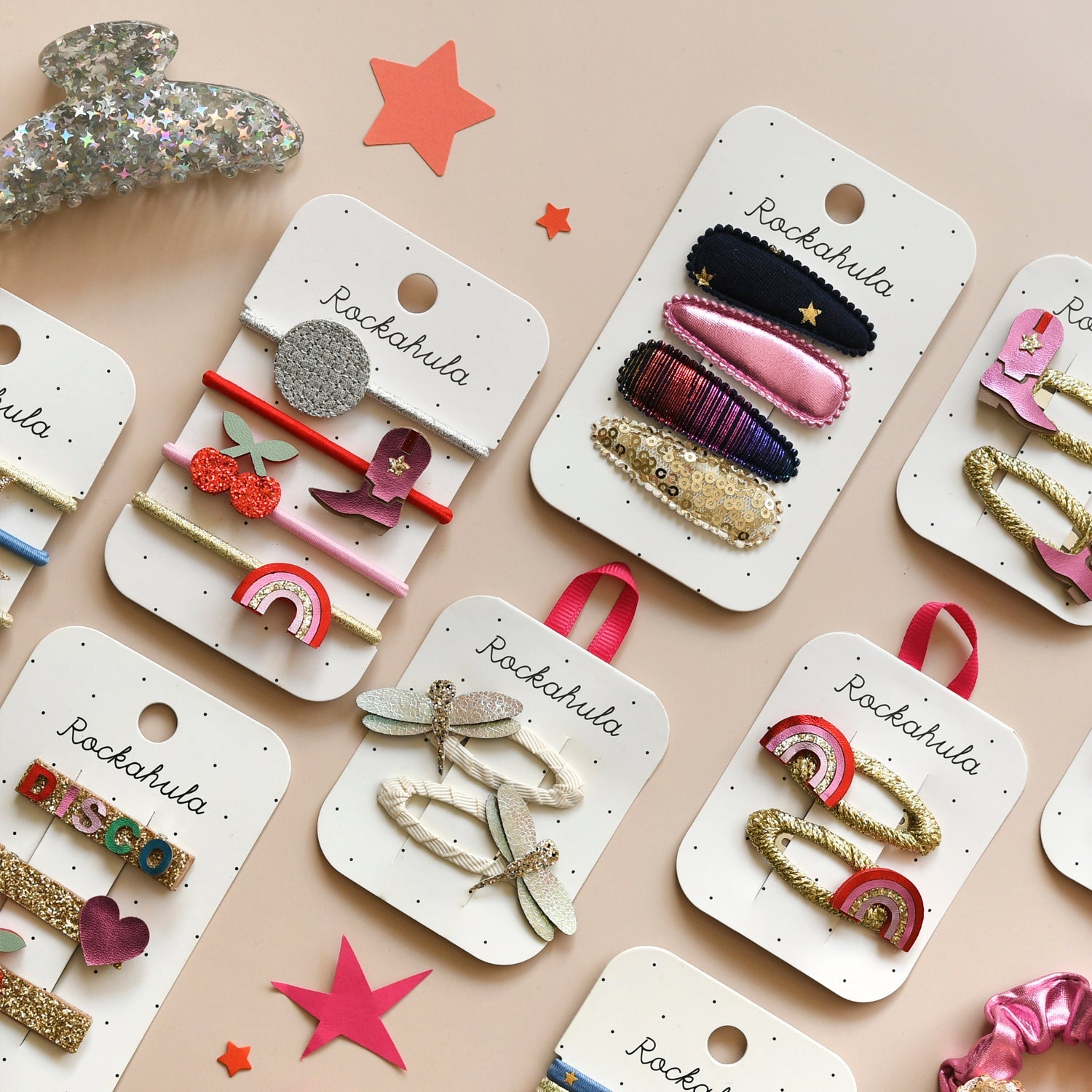 Quand elles ne planent pas délicatement au-dessus de leur étang, ces deux adorables petites libellules se perchent sur nos pinces à cheveux recouvertes de ruban gros-grain. Dotées de doubles ailes pour un vol rapide et d'un corps pailleté, elles sont l'accessoire parfait pour les aventures de fin d'été !