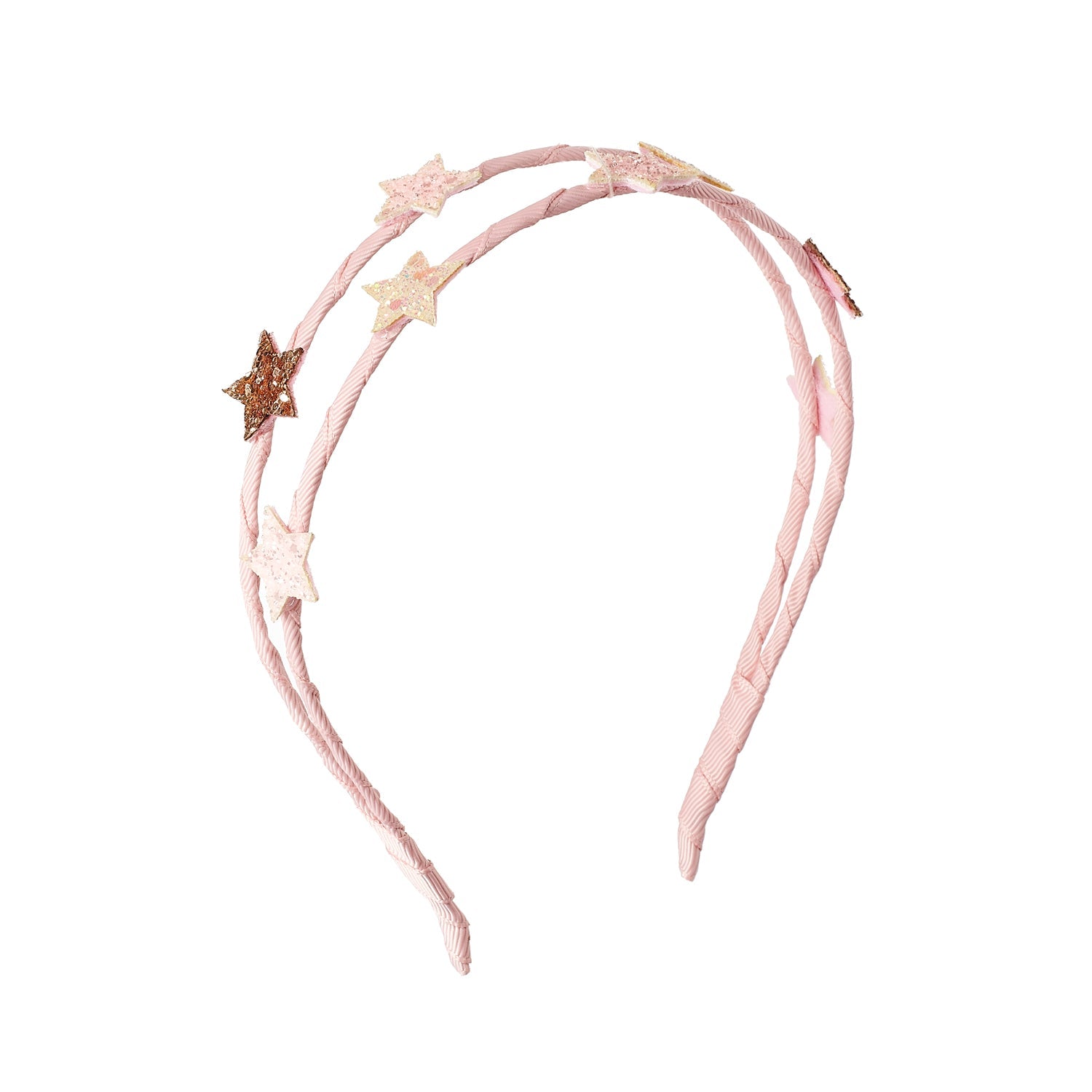 Notre double serre-tête est orné de deux rangées d'étoiles scintillantes, idéal pour ajouter une touche d'éclat à toutes les tenues de fête ! Recouvert d'un doux ruban rose, ce serre-tête est conçu pour s'adapter confortablement aux petites têtes.